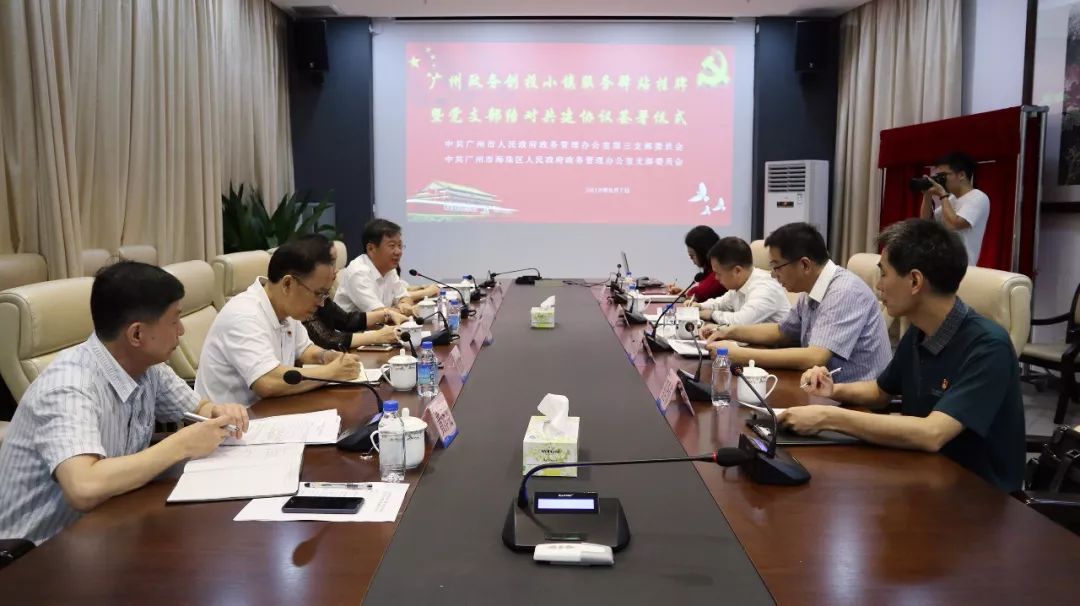 6月7日,广州政务创投小镇服务驿站挂牌暨支部结对共建协议签署仪式在广州创投小镇举行,仪式由市政务办审批协调处处长陈嘉强主持,市政务办党组成员、副主任陈育良,审批协调处副处长屈艺娇、副调研员马全有,海珠区政务办主任黄津、党组书记练铭钦、副主任魏丽萍、企业审批服务中心主任黄泽亮,广州创投小镇董事长黎名准等有关人员参加仪式。