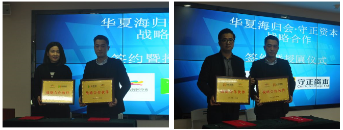 会上,陈健生会长作为华夏海归同学会、广州市欧美同学会的代表与广州创客邦、守正资本进行了战略合作签约仪式。